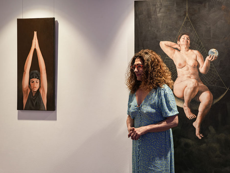 - Carmen Cañadas: With consummate technical expertise, Carmen Cañadas presents a transcendent reflection through her artwork. Three figures, dressed in somber attire, engage in a silent conversation that paints a desolate image of a deserted land. The narrative woven into this piece sparks contemplation and curiosity. Discover Carmen Cañadas’ artworks