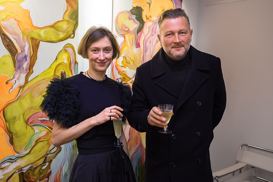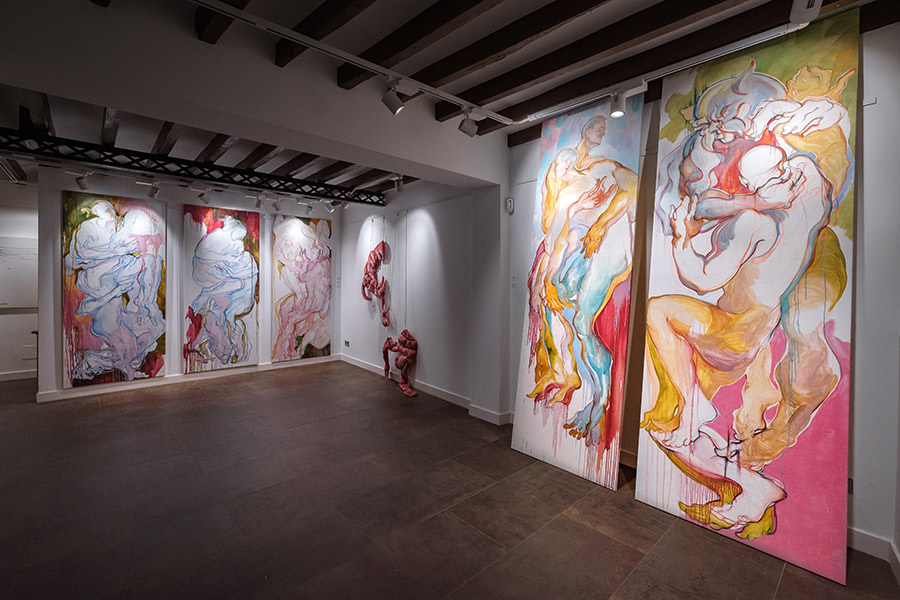 Her iconography of bodies, with an ostentatiously esthetic quality, harkens back to the Old Masters’ sketches. However, this “rough copy” quality is a pure form of “becoming” for Gorelova, enabling her to merge classic draftsmanship with expressionist dripping. The interaction of bodies materializes in a riot of color, reminiscent of Yves Klein’s performances but with a diverse array of contrasting color combinations.